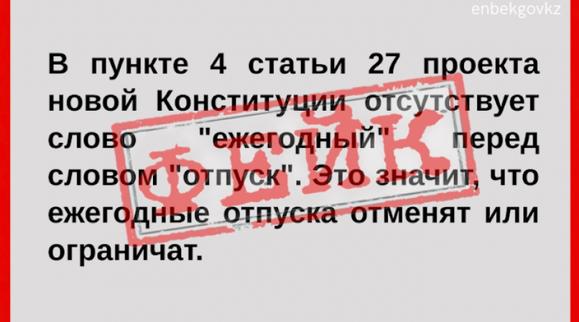 Алматы. 24 февраля. Центр информации - В информационном пространстве распространяются утверждения о том, что отсутствие слова «ежегодный» перед словом «отпуск» в пункте 4 статьи 27 проекта новой Конституции якобы может привести к ограничению прав работников, сообщает пресс-служба МТСЗН РК.